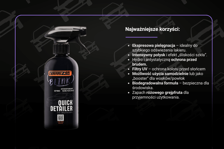 Quick detailer to nie tylko „spray do połysku” – to kluczowy element regularnej pielęgnacji lakieru, który realnie wpływa na trwałość powłok ceramicznych i efekt wizualny pojazdu. A zatem: jeśli chcesz, by Twój samochód zawsze prezentował się nienagannie, sięgnij po Ceramizer Blink – hydrofobowy quick detailer. To połączenie doświadczenia marki Ceramizer, nowoczesnych właściwości hydrofobowych i przyjemności użytkowania.